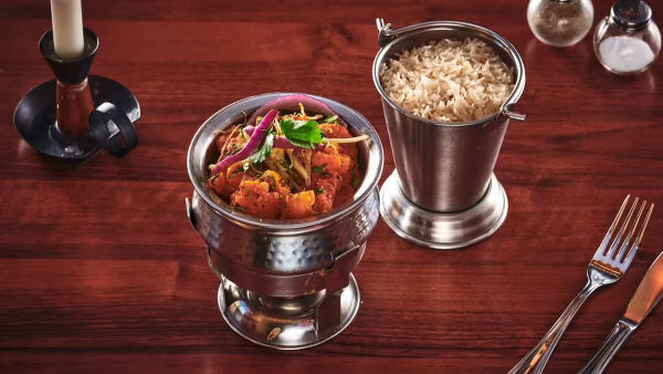 Blanding av forskjellige grønnsaker i masalasaus. Serveres med ris (M,C,SN).